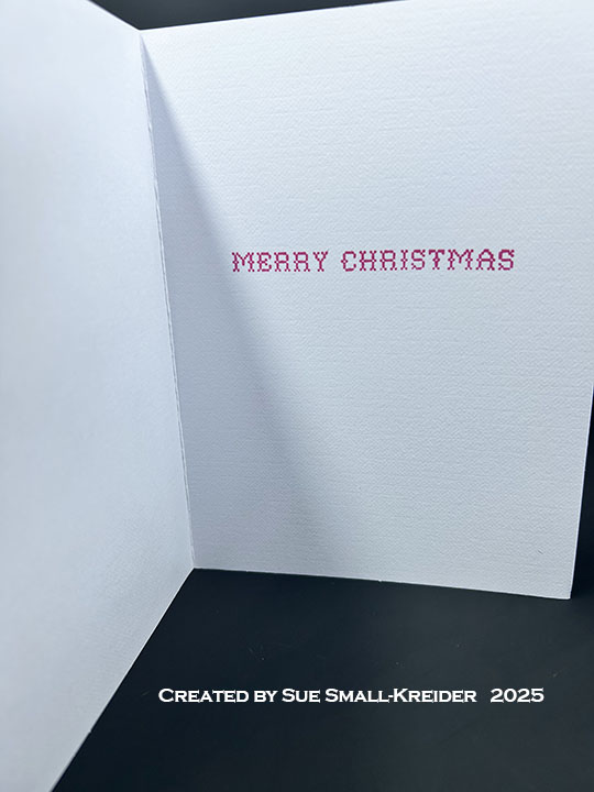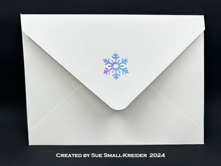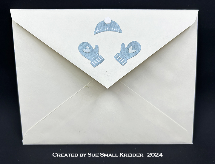 Sentiments: The die-cut sentiments of βChristmas Greetingsβ and βho, ho, hoβ are from Karen Burnistonβs Small Script- Christmas die set. Another Karen Burniston product, her Winter Hugs stamp set, was used to stamp βStay warm and drink Hot Cocoaβ in brown ink on the catalog (6×9-inches) envelopeβs back flap.