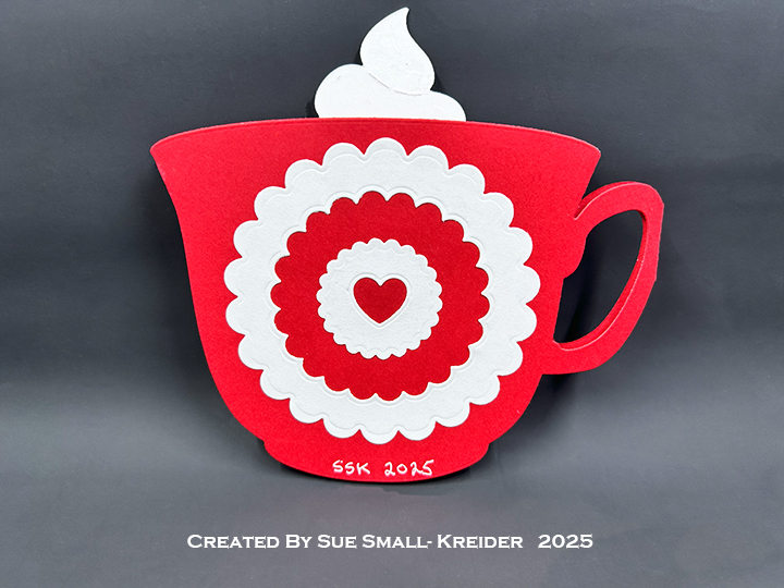Cardbase: I started with an 8.5×11-inch sheet of red cardstock of at least 80lb. weight and cut out the shaped card base using the Trinity Stampsβ Trini-Tea Cup Card die set.