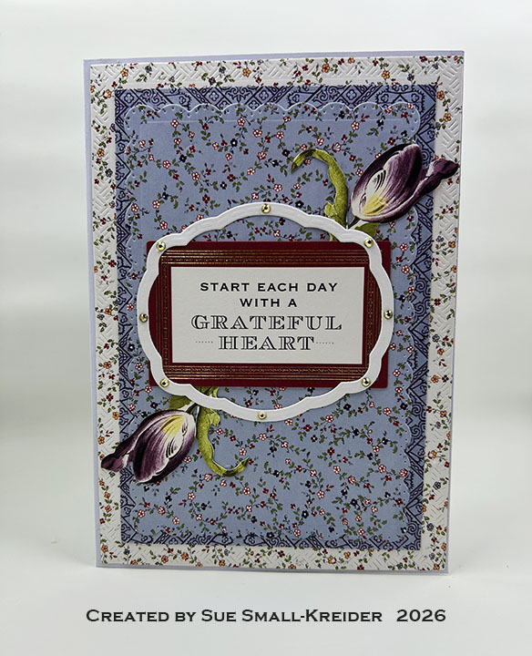 Sentiments: The front sentiment “Start each day with a grateful heart” and the inside “Birthday” are embellishment cards from Anna Griffin. The white label frame around the front sentiment is cut using the label frame die from Rectangles and Labels – Crosshatch. “HAPPY” on the inside is die cut from gold mirror cardstock using the letters in Happy Birthday Lorna Add-Ons. The white personal message label is cut using the Greeting Labels.