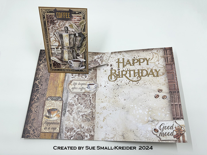 On the top inside panel I added another Art impression’s stamp of a tricycle riding elephant that I had colored and fussy cut out with its hat flying off.