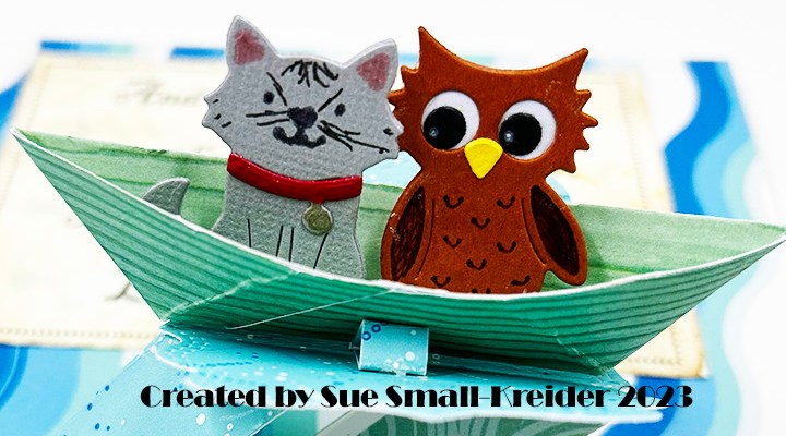 Cat: (Watch the assembly video before starting.) Cut two cats and two collars using the Cat and Dog set. Using die, stencil face on to one cat piece. Trim tag off one collar and glue to back cat piece and tagged collar to front cat piece. (I used markers and glitter brushes to color the collar.) Glue the green tab cut from scrap green cardstock used for the boat to the back side of one cat piece and then glue the other piece sandwiching the tabbed piece in between.
