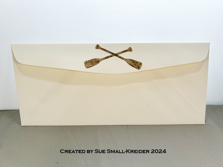 Envelope: The #10 business envelope back flap has a pair of die cut oars from the Boat Pop-Up set glued to it. They are inked by rubbing them over the brown ink cube.