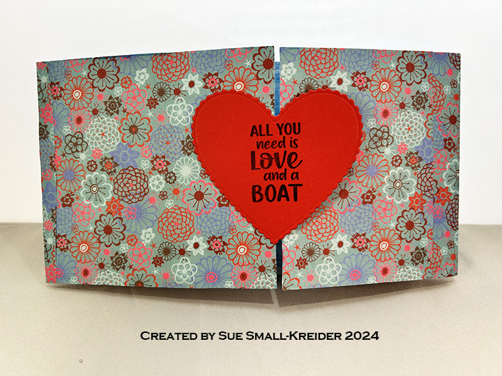 Sentiments: The stamped sentiments are from Karen Burnistonβs new clear stamps sets β βAll you need is love and a boatβ from Sail Away set and βHappy Anniversaryβ from Seasons set. βLove youβ is a die in Word Set 9. The front sentiment is stamped on the scalloped heart from the Hearts β Crosshatch set. A tiny bit of a Velcro hook and loop sticker was attached to the back of the right side of the heart and the cardbase as a closure.