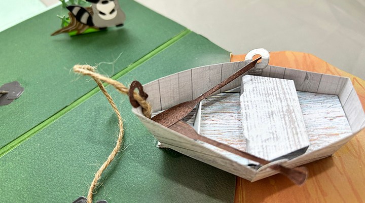 Boat Pop-Up: Using the Boat Pop-Up die set, cut one of the boat’s hull or sides and one of the boat deck from matte silver cardstock (or use my trick of dulling the shine with dried layer of glue.) Cut two of the tabbed mechanism strips from a lightweight cardstock. (Assembly video for Boat Pop-Up set is at the bottom of the linked page.) Follow the directions to assemble boat except replace the rowboat seat with the fishing seat and use the pail of fish to cover front tab. Attach outboard motor using the slotted mount strip. No need for oar locks or oars.