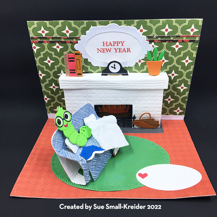 Decorations: Tea and books often go together and the Tea and Coffee Borders set has both teapots and teacups. The green picks that the sentiment and books are attached to come from the Bouquet Bits die set. The green foliage pieces come from the Flower Pot Add-ons set. The books and bookworm are all from the Bookworm set.