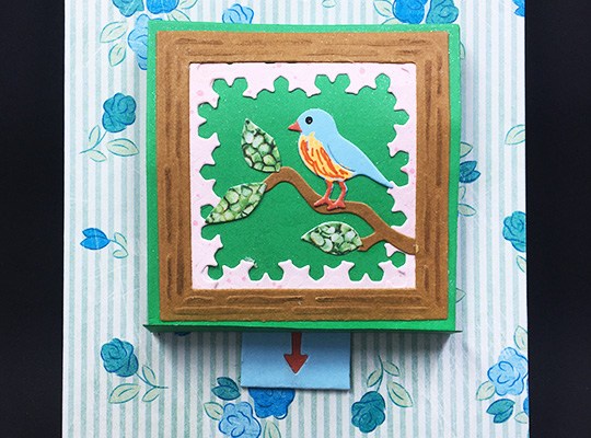 Just like the inside background panels, the card back was decorated with two stripes of decorative papers taped together and the die-cut using the largest crosshatch rectangle from Karen Burniston’s Long Rectangles-Crosshatch. The cut outs of “TEA” from the front panel were glued onto the back .