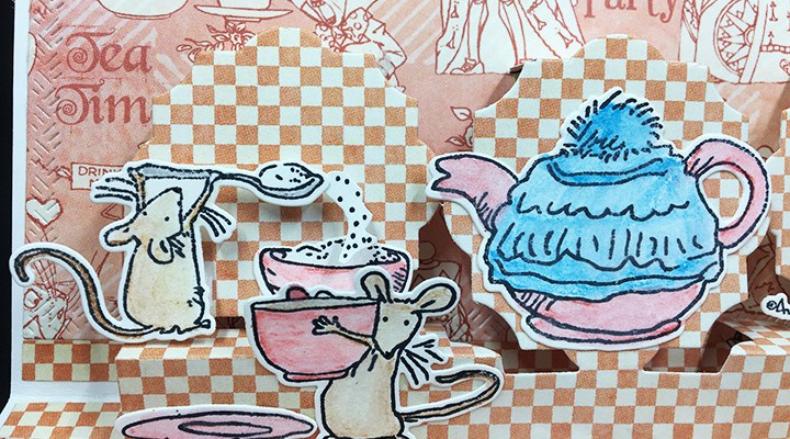 To pop-up the inside scene, I used Karen Burniston’s Little Labels Pop-Up. The stamped and water-colored mice having a fun party are drawn by Anita Jeram.