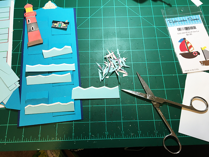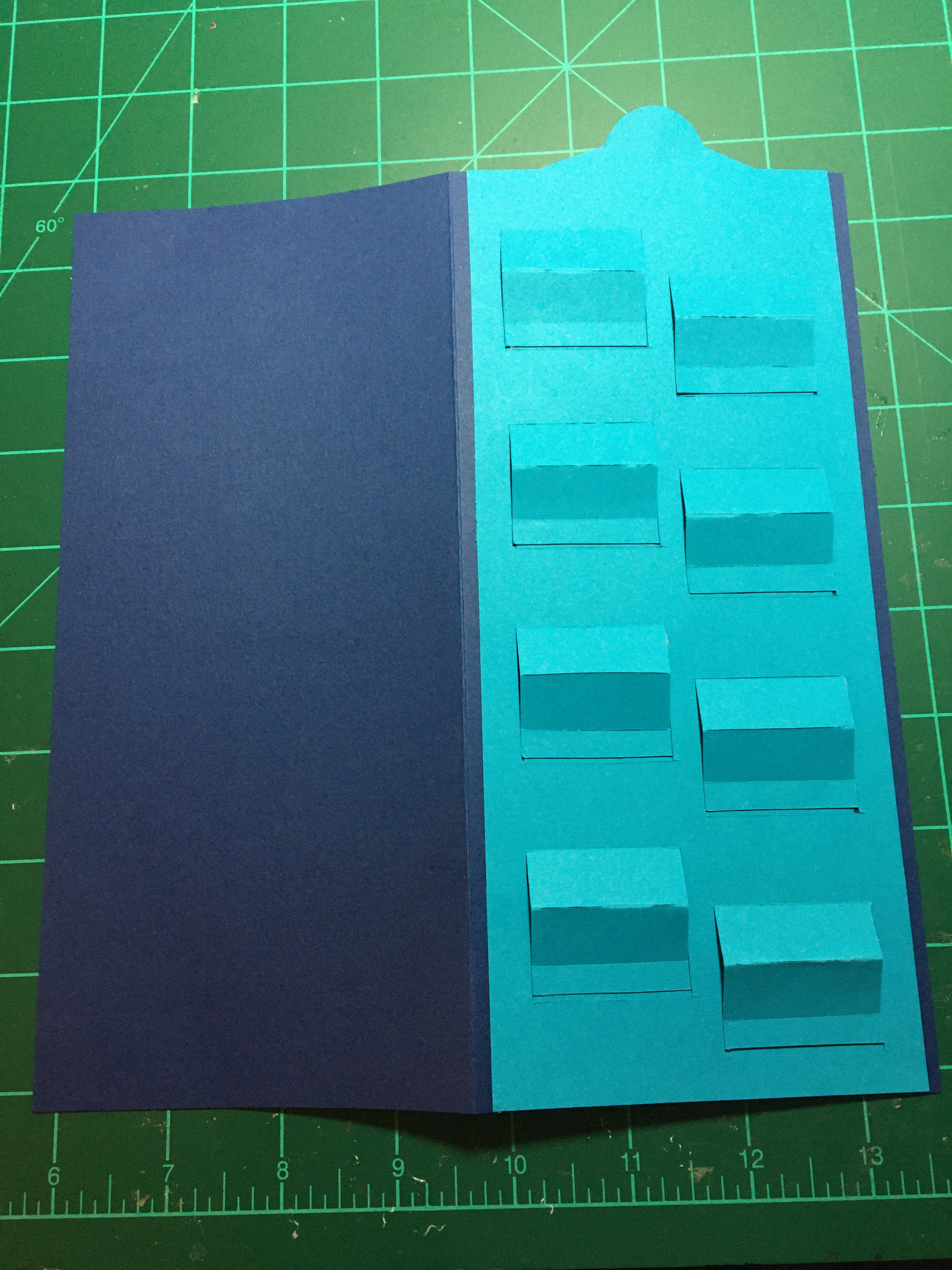 I covered the fronts of the aperture panels and the back center panel with green patterned paper before adding sentiments.