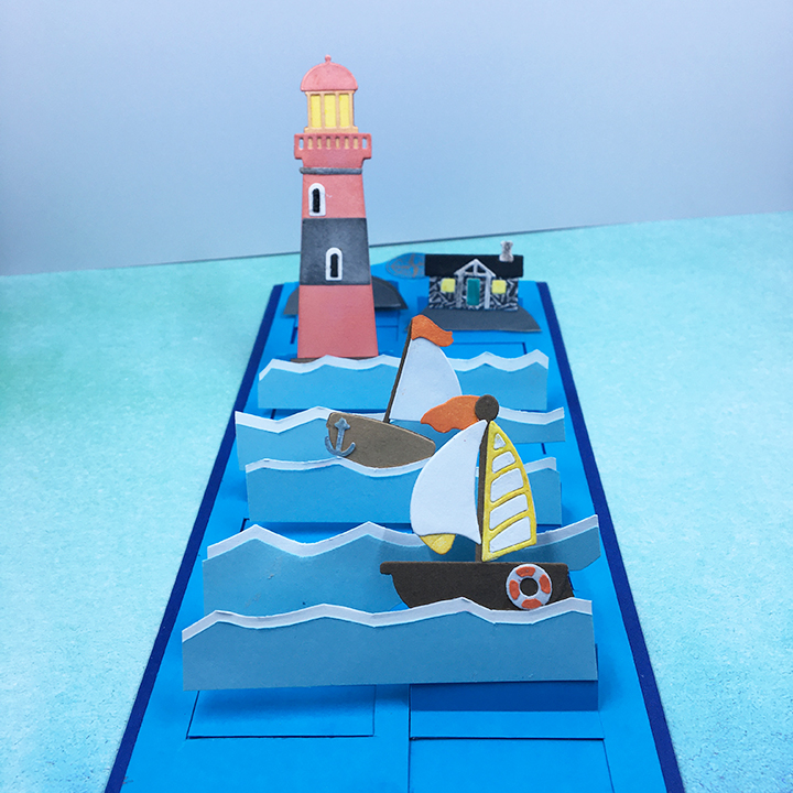 Train the bench to fold up, before gluing on to card base. To glue the bench into the card. Add glue first to rectangle bottom strips and position the onto the card “floor” near the fold. Glue bench back on to center panel of card. Move the bench while glue is still wet for best positioning.