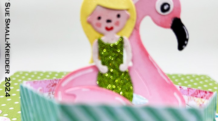Pool: (Watch assembly video above for this modification of the Cake Pop-Up.) Cut two of the largest cake layer in the Cake Pop-Up die set from water patterned paper. Cut another two using the same die piece from a pattern paper that will be the outside of pool. Trim off bottom tab and four-sided trapezoid top flap from each of the outside pool pieces to form a tabbed strip. Using the four-sided trapezoid as a pattern trace and cut out two pieces from water patterned paper. Assemble as directed adding mermaid on flamingo float. Attach to inside of top-fold card. Decorate the inside cardbase with a beach ball from Beach Charms and tiny flamingo from Beach Borders.