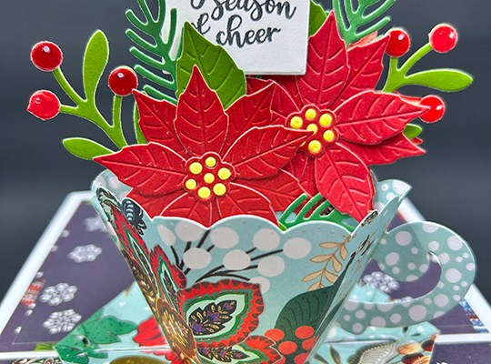 Cardbase: Cut eight dotted lavender cardstock hexagons using the largest die in the Hexagons – Crosshatch. Using the next two plain edged hexagon dies in the set, cut a total of 12 of the medium hexagon from patterned paper and six of the smaller die also from patterned paper. Cut two sets of the Surprise Ball Access Tabs from the dotted lavender cardstock. Assemble card as show in video.