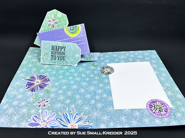 Sentiments: All the sentiments were stamped in black ink using Karen Burniston’s Birthday Belated and Photo Memories stamp sets. The stitched white rectangles are cut from white cardstock using a die from the Flip Frame Pop-Up die set.
