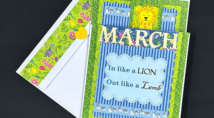 Sentiments: The front sentiment of “March – In like a lion and Out like a Lamb” was originally from the Farmer’s Almanac. I die cut the word “MARCH” using a retired Spellbinder’s Font One – Upper Case and digitally created the rest of the sentiment and then die cut it out using the scalloped edge rectangle die in the Pop N’ Swap die set. Inside, a journaling card was used from the Graphic 45 Spring Is In The Air collection pack for the “Blossom by Blossom, Spring begins.” The tag was cut using the same die as on the card front with a stamped sentiment of ” Sending Happy Thoughts” from Karen Burniston’s Stage Scenes stamp set. I used a hole punch to have a spot to thread some baker’s twine through to make a tag.