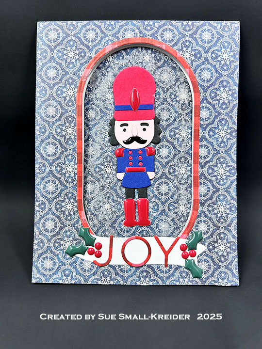 Nutcracker & Drum: Referring to the image of the nutcracker on the packaging for the Spellbinders Dancin’ Nutcracker Fritz die set, cut out all the pieces using your own color scheme. Cut a black strip to go behind the face for the eyes. (I cut two drums – one for the front and one for the card back along with drum sticks.) Assemble nutcracker and drums as shown in video above.