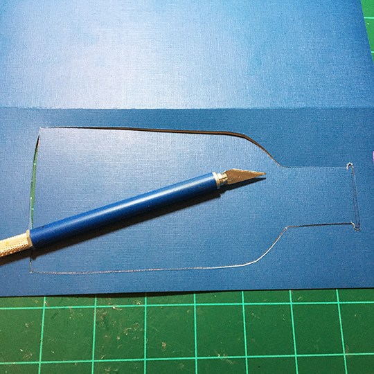 Cardbase: Using a 8.5×5.5-inch rectangle of double-sided patterned cardstock, fold rectangle in half to form a 4.25-inch wide by 5.5-inch tall side fold card. Decorate the inside with wavy ripples using the Ocean Edges dies. (I choose to let the cardbase paper pattern be one shade of the ocean waves while the other waves are cut from decorative cardstock with white water ripples on them. If you make several layers of waves the card will be very thick and hard to close. If this happens use the special die in the Cruise Ship Add-On set to cut two slots on either side of the fold to slide a paper clip through to hold the card open.)