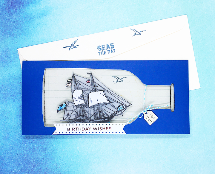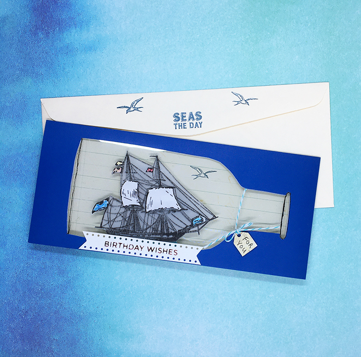 Envelope: The card fits into an A2 (4.25x 5.5-inches) size envelope with an anchor and chain glued to the back flap. The anchor is from the Cruise Add-Ons die set.