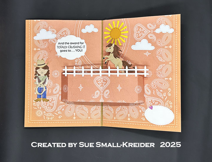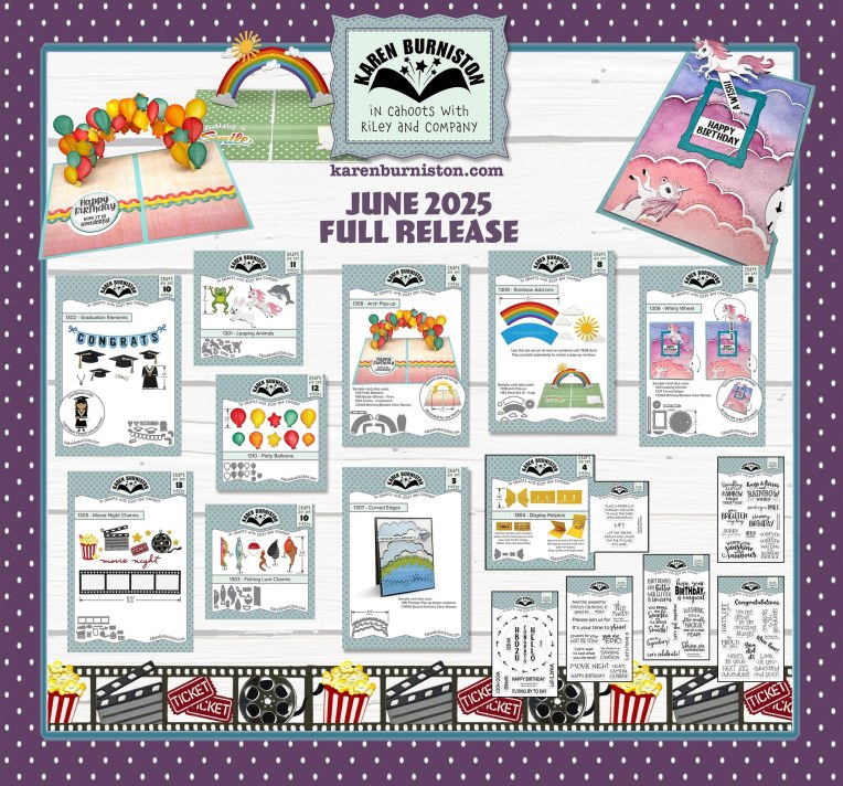 It’s Sneak Peek Week for Karen Burniston’s June 2025 release of ten new dies and five new clear stamps. For this cowgirl graduation card, I used several of the new sets including Leaping Animals, Movie Night Charms and Rainbow Add-Ons die sets and Movie Night stamp set.
