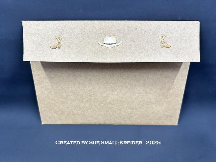 Envelope: The card fits into an A7 (5x 9-inches) size envelope with a die cut a cowgirl hat and boots the back flap using the Tiny Accessories 3 set.