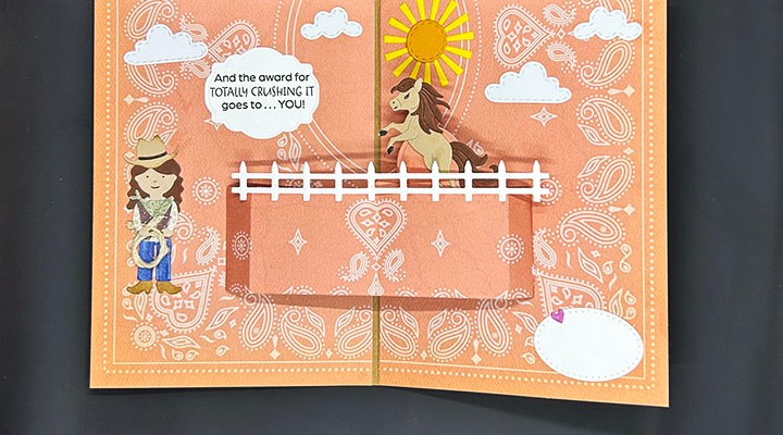 Horse and Fence: Cut one tan unicorn body from the Leaping Animals die set and from dark brown cut the tail and mane pieces. (I cut three of the tan because my cardstock was less than 80lb weight.) Use the die stencil features to draw in the horse’s eye, mouth, nostril and hooves with a thin black marker. Cut one fence from heavy white cardstock using the Farm Edges die set. Glue fence to top edge of pop-up over piece and glue horse to inner pop-up tombstone piece.