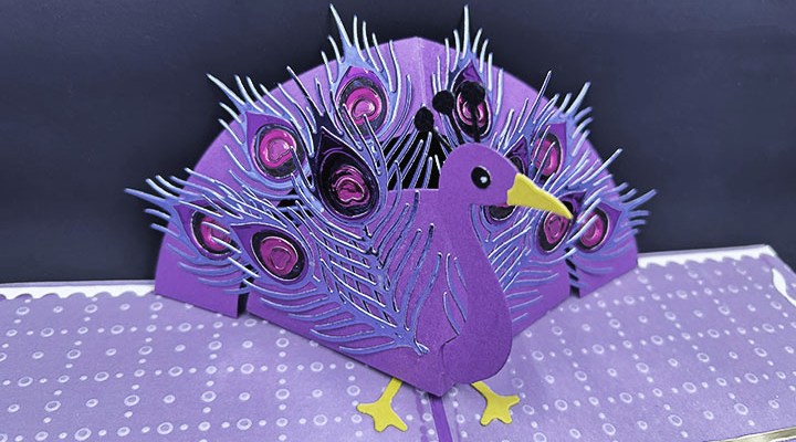 Stage Pop-Up Base: Using the Stage Pop-Up die set, cut two of the largest die from patterned cardstock. From the same patterned cardstock, cut two of the stage-side strips. After stamping and cutting the 6 decorator rectangles, glue them onto the front panels of the stage-side strips. Assemble the stage platform as shown above in the video. (Below is what the completed card looks like when folded flat.)
