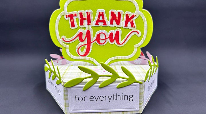 To decorate, cut six of the leafy stems in the Thank You Lorna Add-Ons from green and glue onto the top of each of the stage sides. Cut two of the flowers in the set to add to the stage floor in front of the “Thank You.” (I used patterned paper that had daisies printed on it, so I did not use the flower center die from the set.)