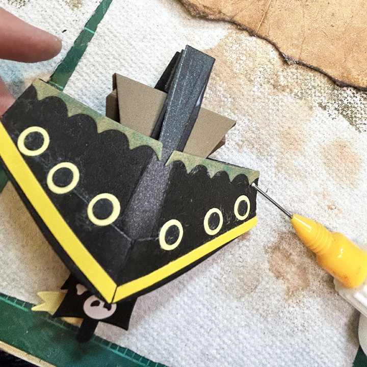 Nutcracker: Referring to the images of the nutcrackers on the packaging for the Nutcracker die set and the video above, cut out all the pieces using your own color scheme. (I cut out the entire body from flesh colored cardstock and then dressed the nutcracker.) The nutcracker is glued into the second layer of the tunnel card at the hat (onto the lattice work of the frame) and at the boots onto the snow piece. (The snow piece is glued to the back side of the frame. )