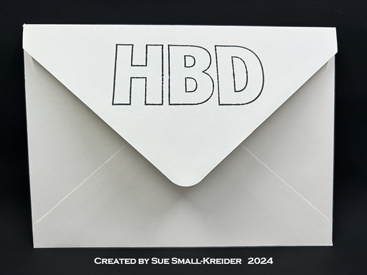 Envelope: The card fits into an A7 (5x 7-inch) size envelope. “HBD” for Happy Birthday is stamped on the envelope flap using a Craft Roulette stamp.
