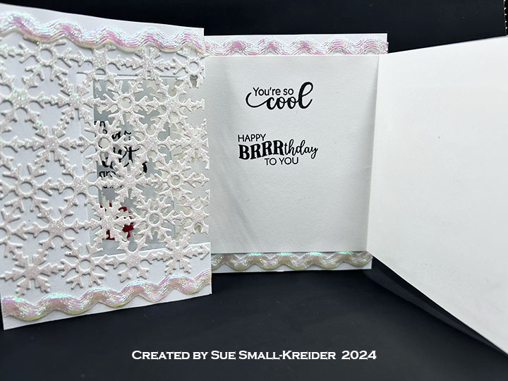 Sentiments: All sentiments” When Snow is falling, Crafts are calling,” “You’re so cool,” and Happy Brrrthday to you.” are from the Karen Burniston Winter hugs stamp set. The “So I made this cool card” stamped on the card back with my signature is also from the same stamp set.