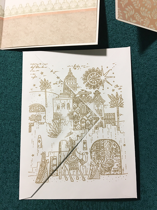 I stamped the A2 envelope back with the Little Town of Bethlehem stamp using Crumb Cake Stampin’ Up ink which almost matches the gold Nuvo drops used on the card.