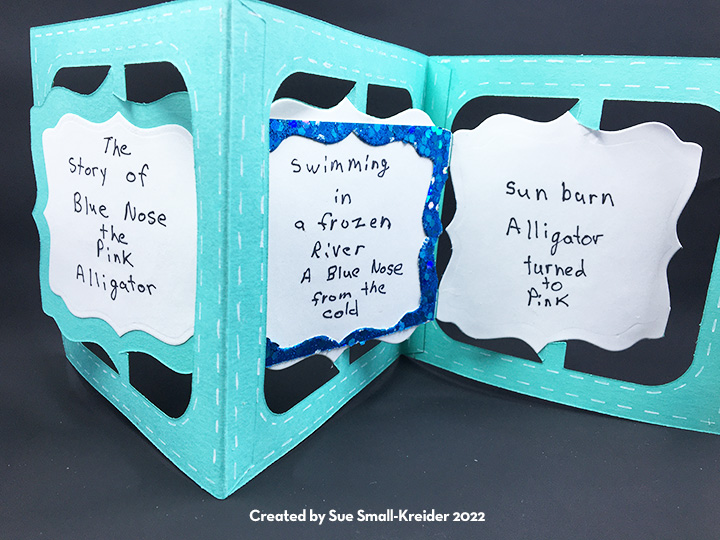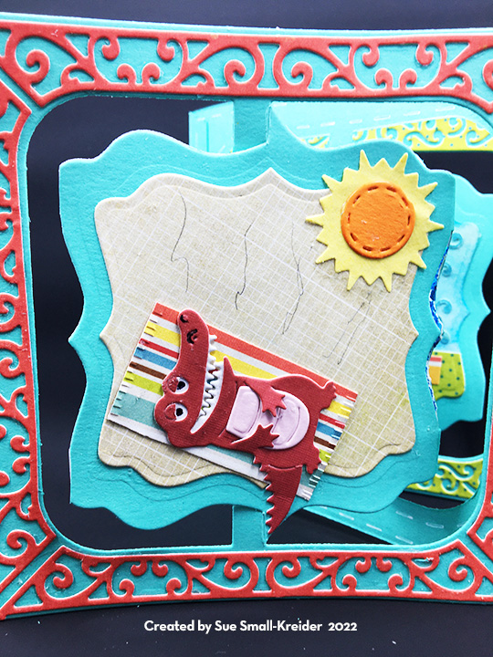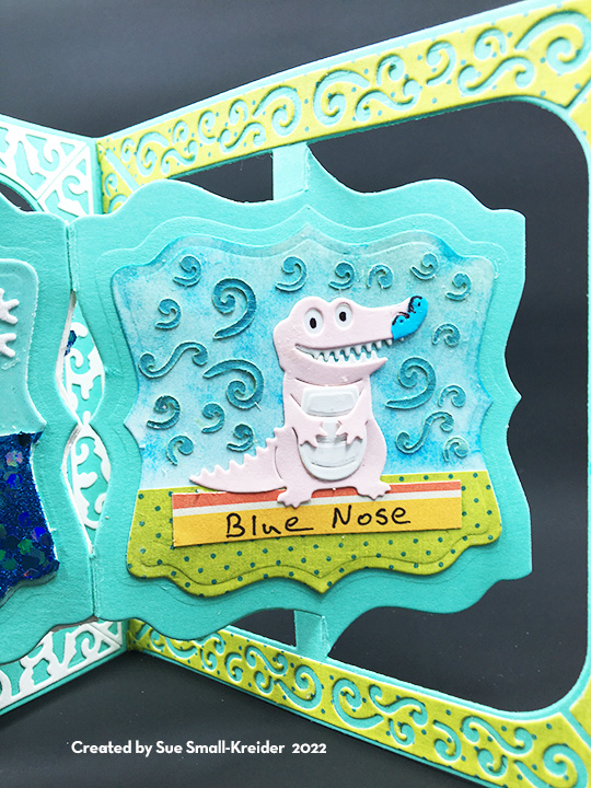 Frogs: Cut four green, leaping frogs from the Leaping Animals die sets. Cut three green, sitting frogs from the Bayou Animals die set. With a white gel pen and frog dies as stencils, add spots and mouths to frogs. Using the eyes die from either animal set, cut four sets of eyes from white and stencil the black pupil of the eye and add a white gel pen dot onto them.