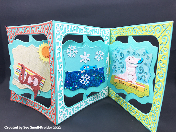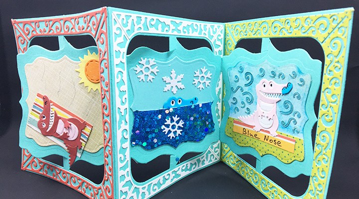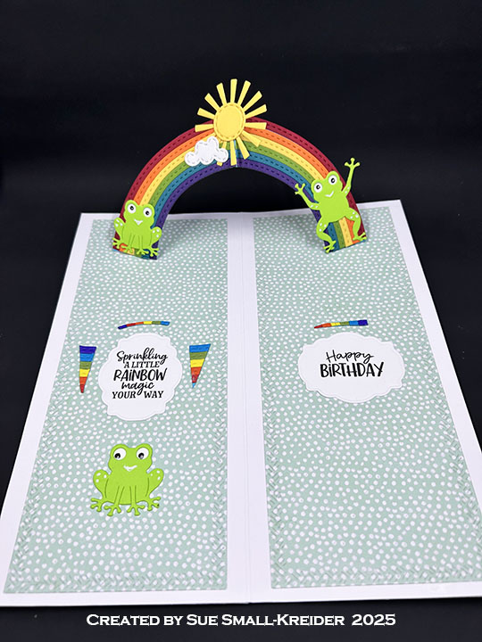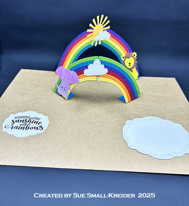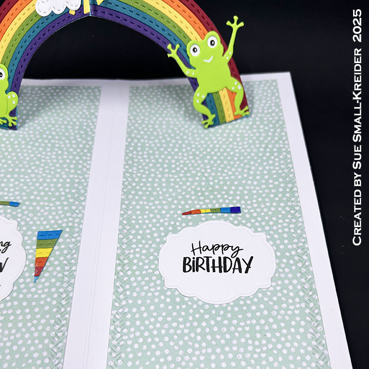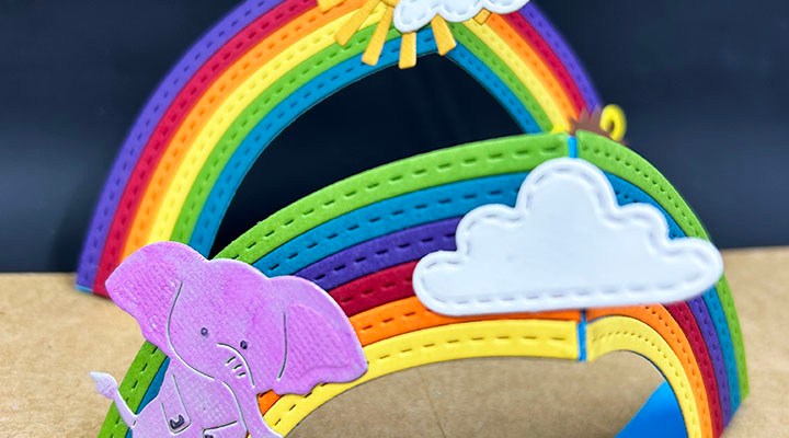 Arch Pop-Up: Cut out the two large arch dies in the Arch Pop-Up from solid 65-80lb. cardstock. Assemble as shown in the video above, adding the rainbow strips which were cut using double-sided adhesive tape. Attach the pop-up rainbow arch as shown in the video.
