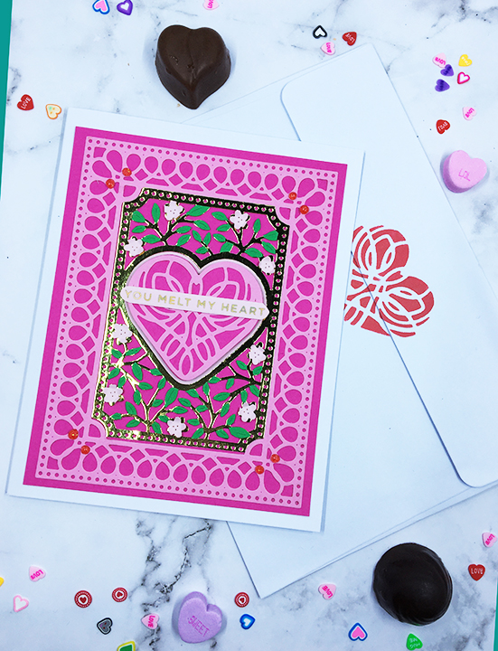 For this card and gift set I used four new dies from Karen Burniston’s December 2023 release – Hearts Add-Ons, Happy Valentine’s Day Shadow, Candy Hearts Box and Mini Gift Bag – as well as her previously released Fancy Label Accordion and Happy Valentine’s Day dies.