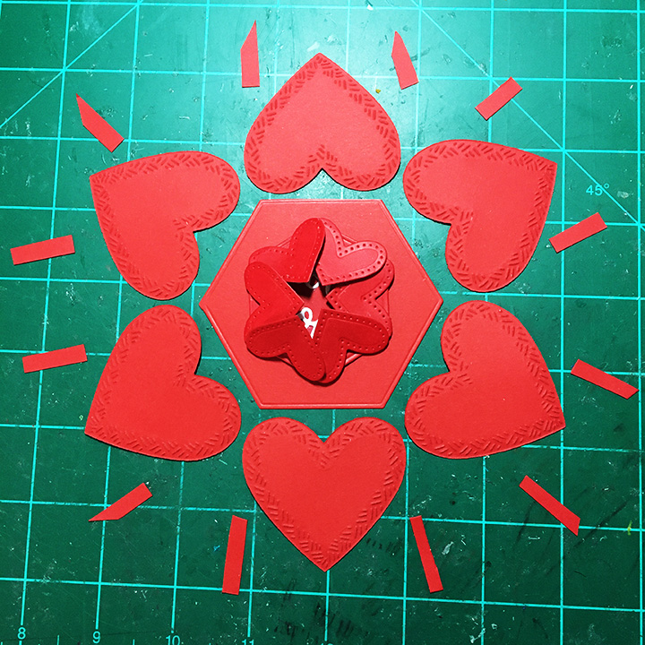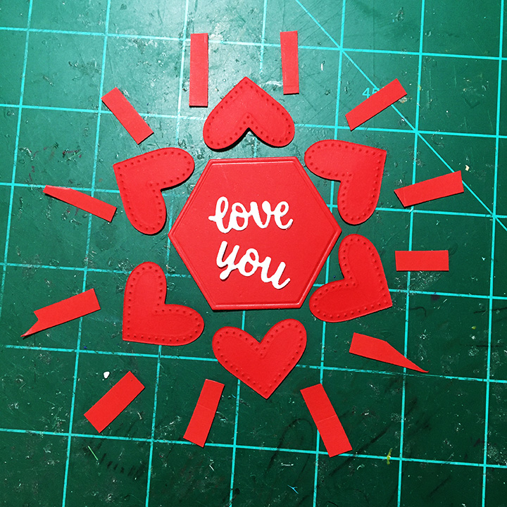 Bag: (Watch assembly video) Using coordinating decorative paper, cut the two Mini Gift Bag pieces and assemble as directed on the packaging. (I used glue to assemble the bag.) Add ribbon or pom-pom string for handles. Decorate with leftover hearts from other pieces in the set.