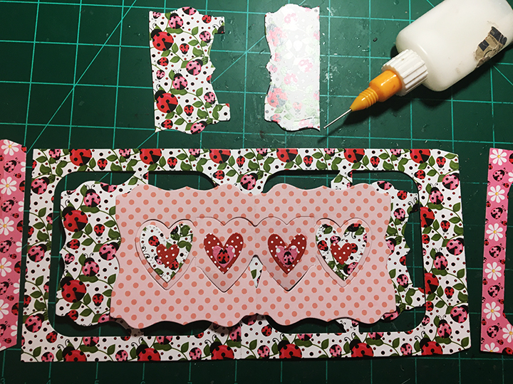 Once the panel is fully decorated, work on the accordion frames that it will be glued onto. Glue two frames together using the outer long tab. From one panel cut the label panel along the pivot point making sure to keep the label attached to the pivot bar. Cut the other label, but the cut will look different than the other panel. See photo below. Add glue to the back side of the hearts panel and attach it to one of the label panels. Add glue to the other end of the hearts panel and attach it to the other label panel. (I die-cut one pivot panel from ladybug paper to go over the back of the pivot panels as a decorative feature and to cover over the tabs from the other panels.)