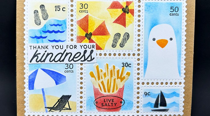 Postage Stamps: Using the stamps and stencils from the Waffle Flower Beach Days collection along with their Postage Collage die and stamp set, I created the beached themed postage collage seen in the video above. (See below Materials Used for all the ink colors used.)